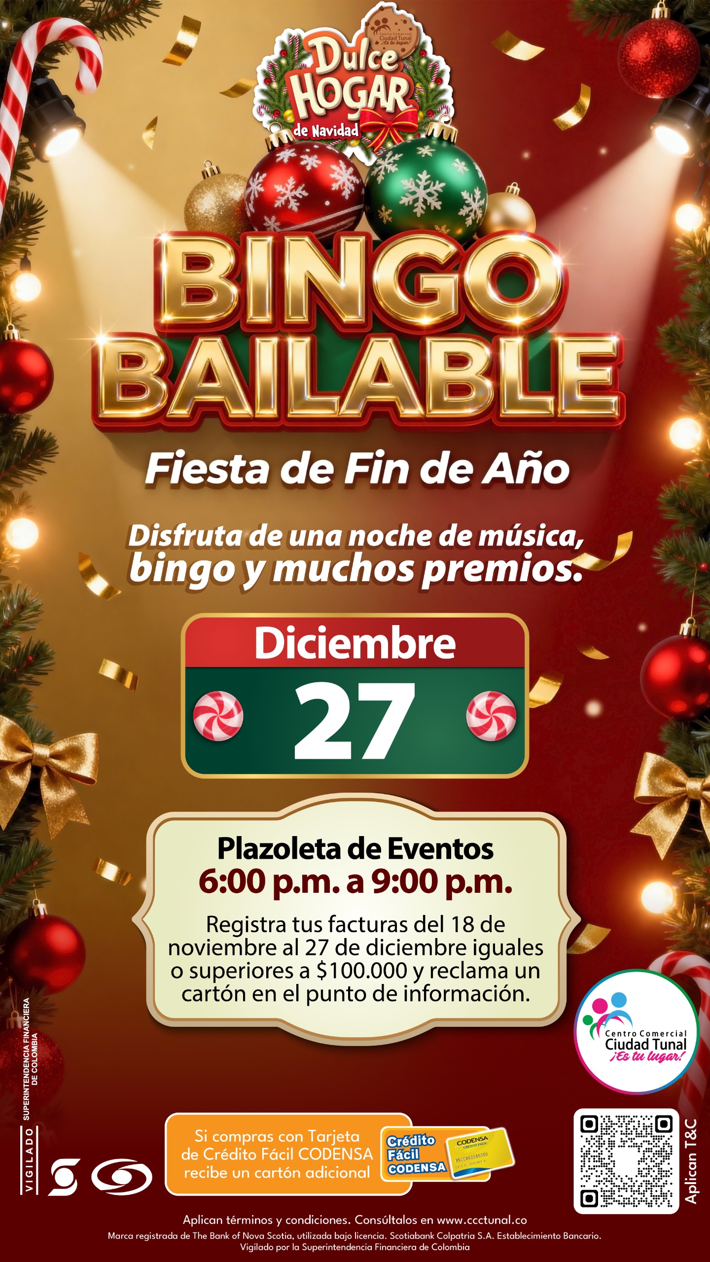 ¡Este 27 de diciembre gana premiso increíbles en nuestro Bingo Bailable! Participa registrando facturas iguales o superiores a $100.000 en nuestro punto de información.