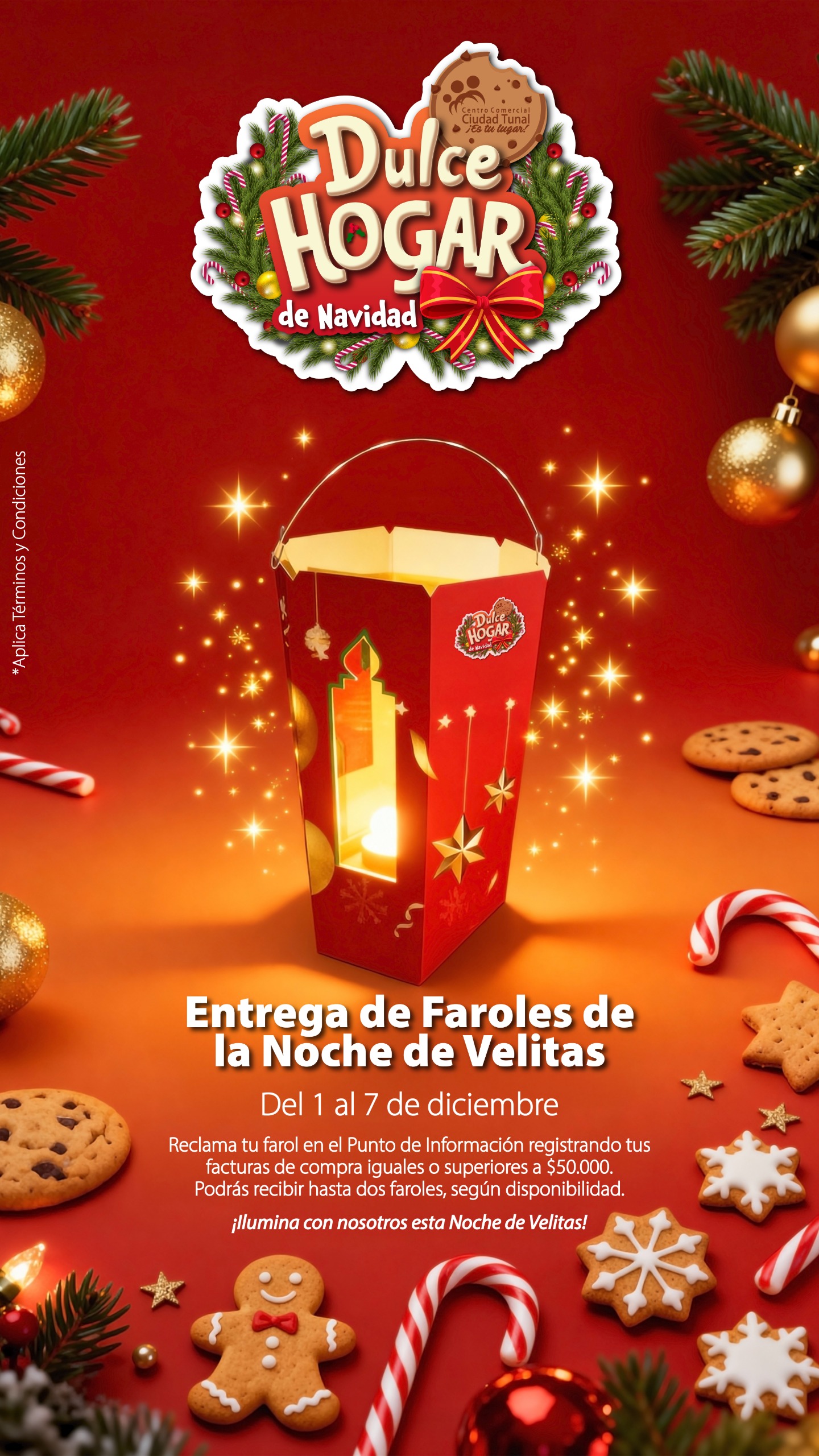 ¡La magia de la Noche de Velitas ilumina el Ciudad Tunal! Del 1 al 7 de diciembre, reclama tu farol en el Punto de Información registrando tus facturas iguales o superiores a $50.000. Llévate hasta dos faroles (según disponibilidad).
