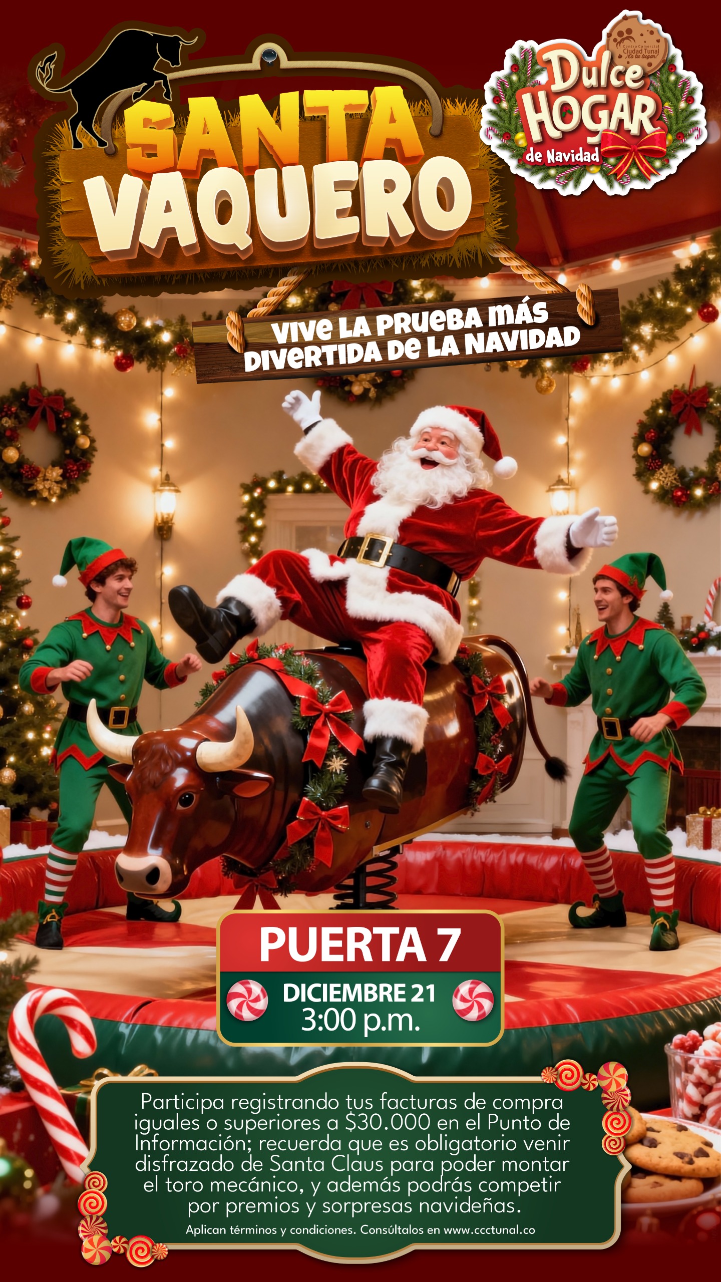 ¡Prepárate para la prueba más divertida! Este 21 de diciembre a las 3:00 p.m. en la Puerta 7, vive el Santa Vaquero. Recuerda registrar tus facturas de $30.000 para participar. ¡No te lo pierdas!